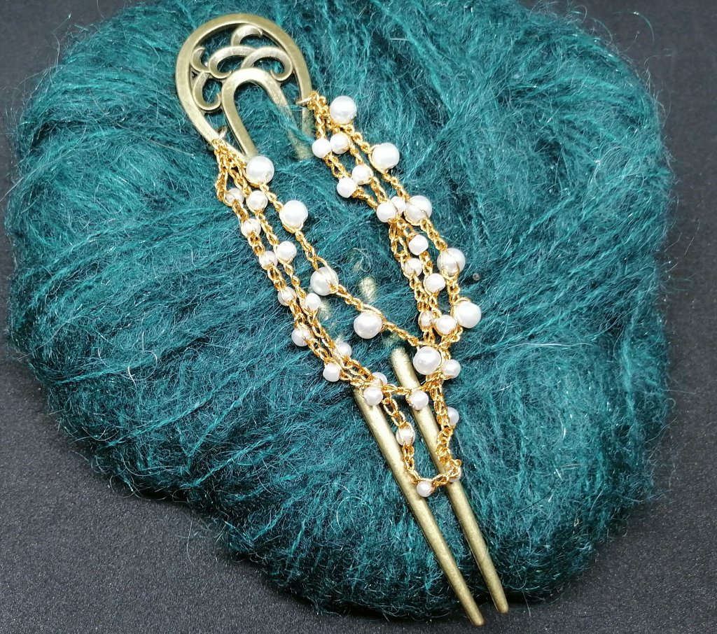 Spillone per fermare i capelli dello chignon. Con due rebbi e una cascata di perle legate da un filo dorato.